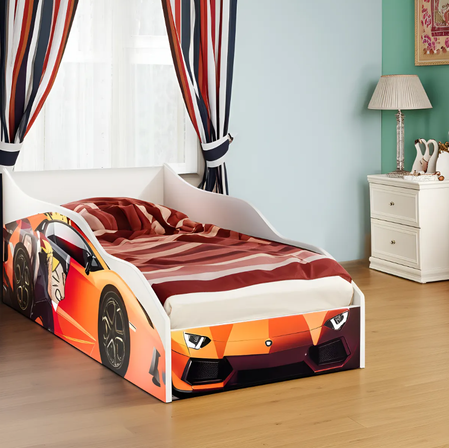 High Quality Orange Car Design Bed with Mattress – Kids Bedroom Racing Car Bed | Wali Kids Furniture Pakistan