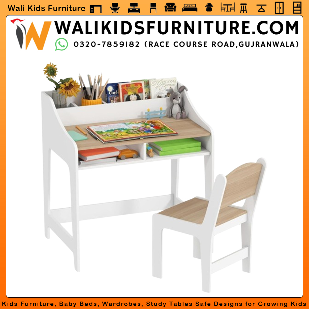- Kids Study Desk and Chair Set Information: Desk: 23.6″ W x 18.9″ D x 26.8″ H. Chair: 11.8″ W x 13.2″ D x 20.9″ H. Maximum load: 55 lbs. (desk), 44 lbs. (chair). Safety standard: ASTM, CPSIA. Recommended Age: 3-8 years old. Assembly required