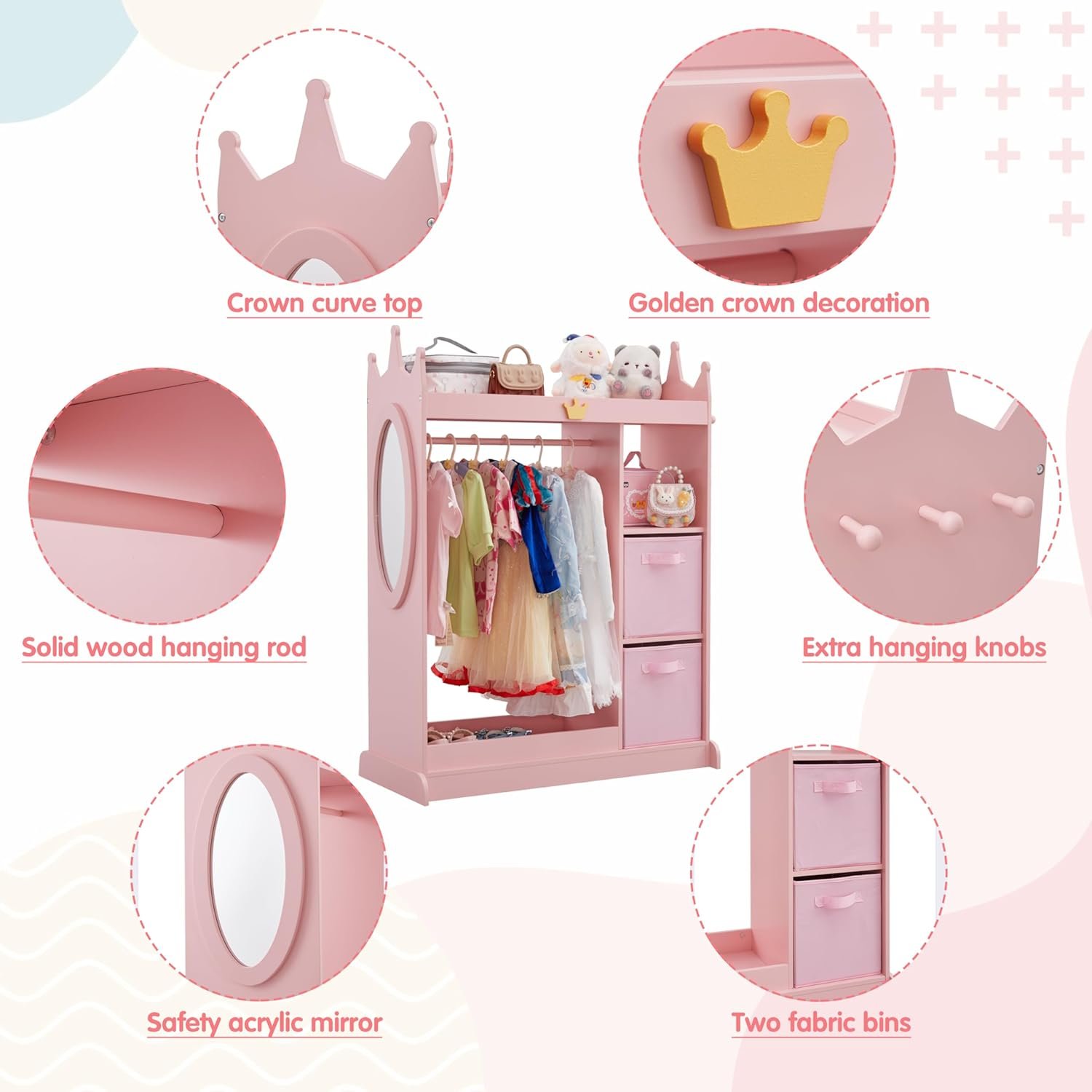 This modern kids wardrobe with mirror allows children to dress independently while adding charm to their kids bedroom furniture. The built-in hanging rod makes it a perfect kids wardrobe with hanging rod for dresses and costumes, while the three shelves and two storage bins provide smart kids storage cabinet solutions for shoes, toys, and folded clothes.