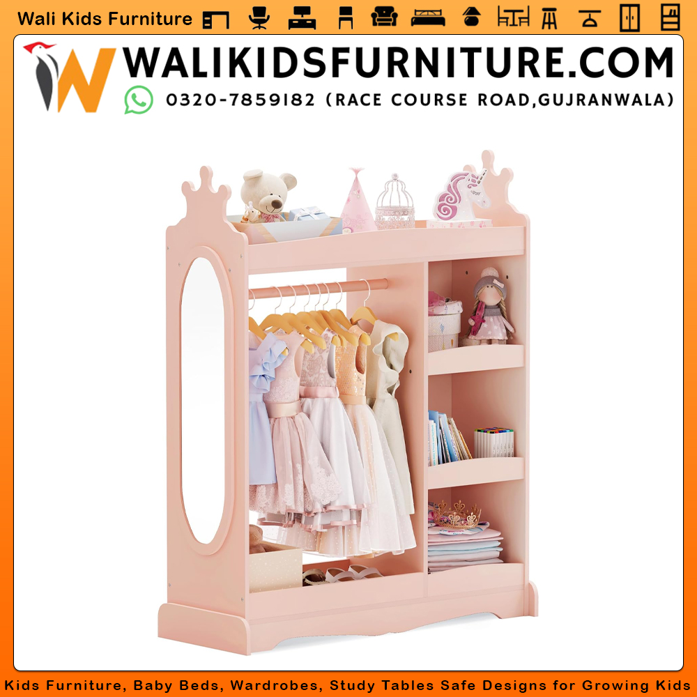 Make your child’s room neat, playful, and stylish with our Kids Dress Up Storage with Mirror, proudly offered by Wali Kids Furniture Gujranwala. This modern kids wardrobe Pakistan is made from durable lamination plywood, ensuring strength, safety, and long-lasting use. Designed for both boys and girls, this functional baby wardrobe Pakistan helps keep clothes, accessories, and costumes well organized.