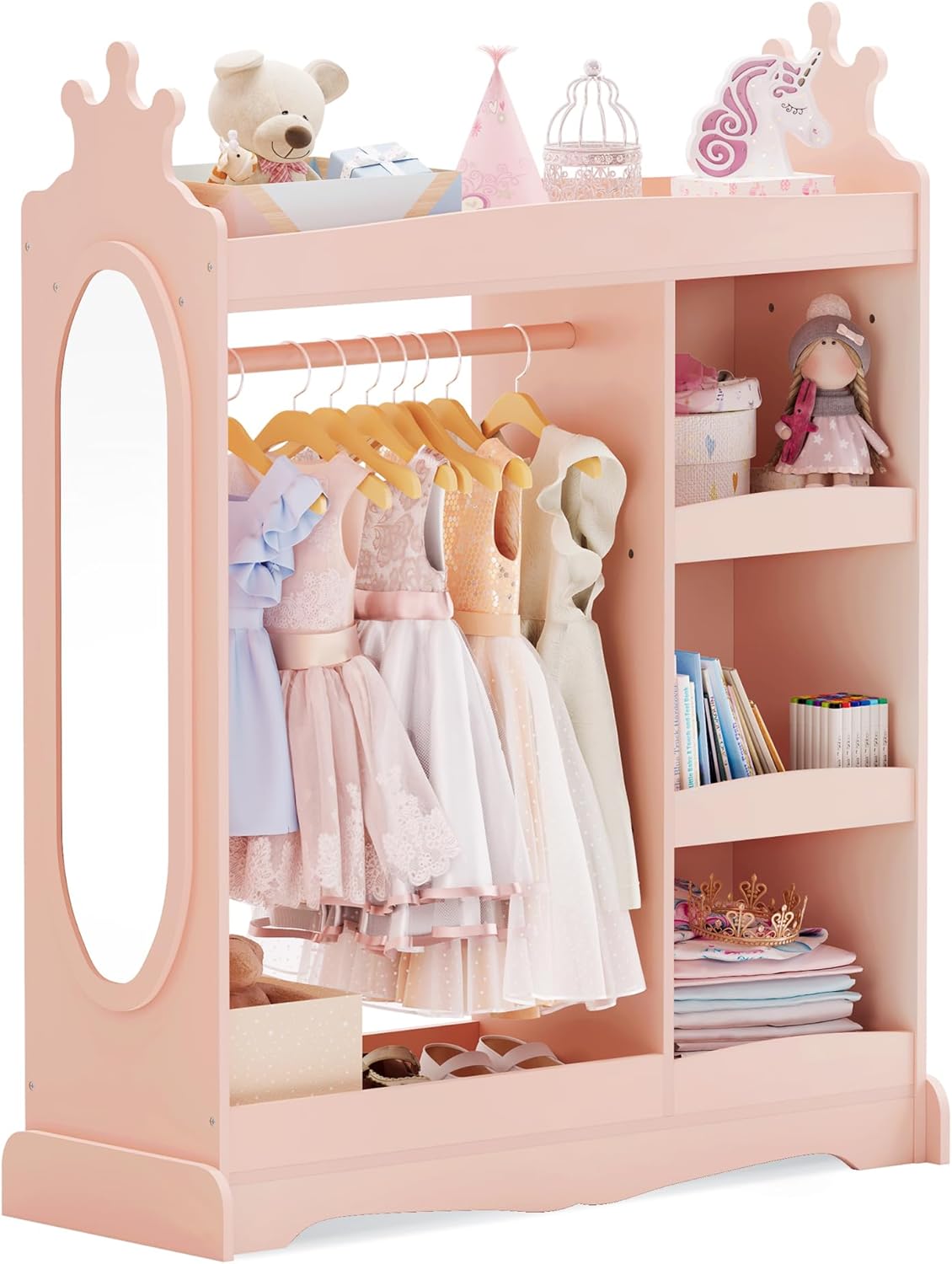 The built-in mirror makes this a practical kids wardrobe with mirror, encouraging children to dress independently. Featuring three sturdy hooks, this kids wardrobe with hooks is perfect for hanging jackets, school bags, or daily outfits. The open hanging design works as a convenient kids open wardrobe and kids hanging armoire, making clothes easy to access for young children.
