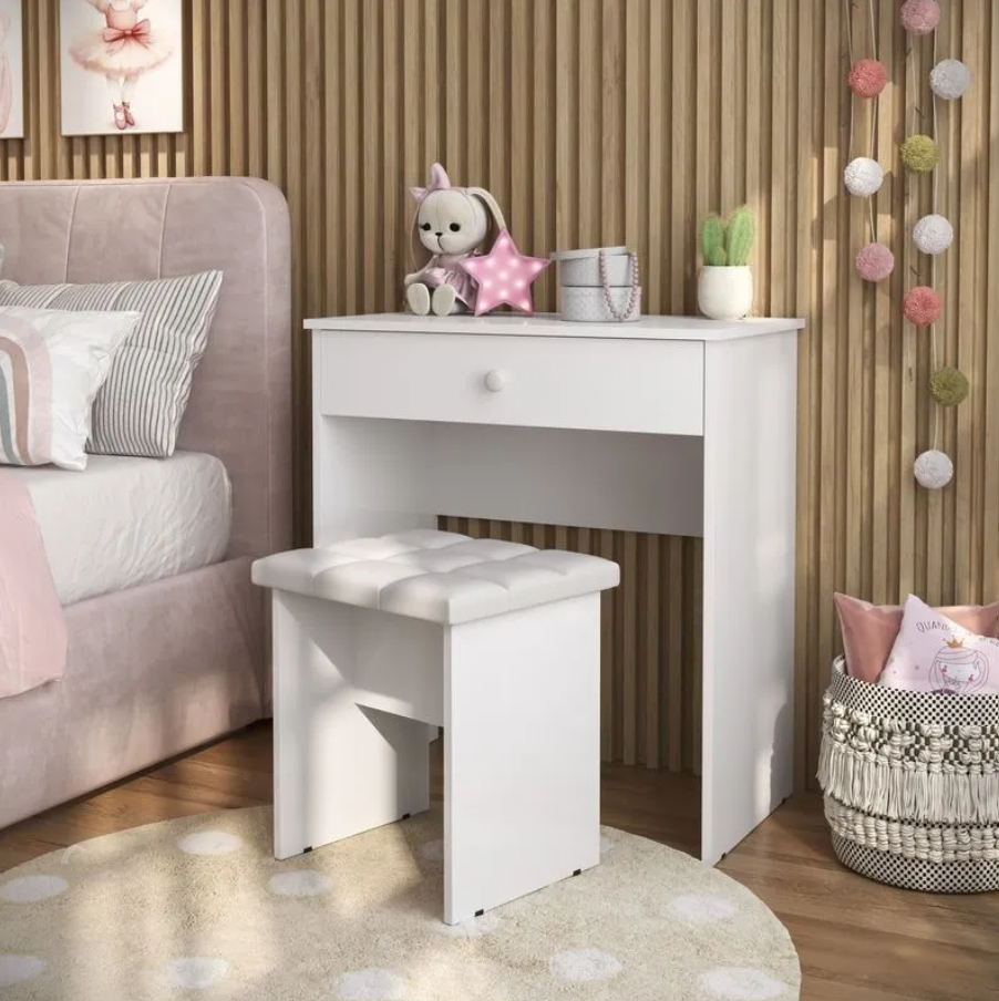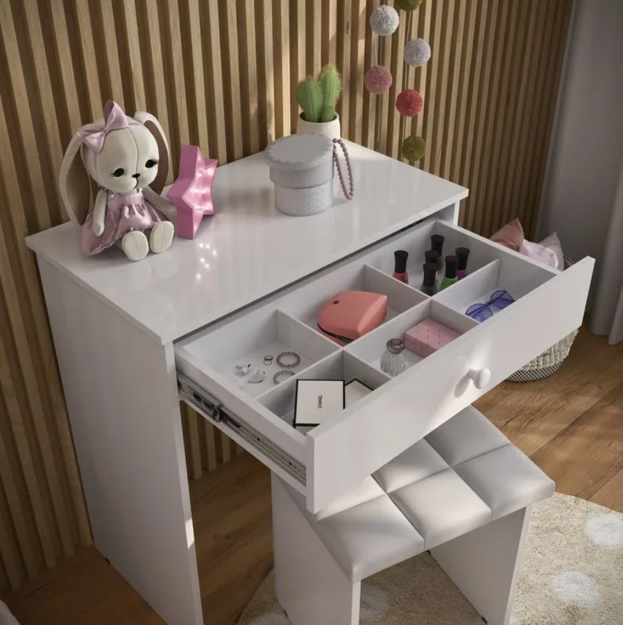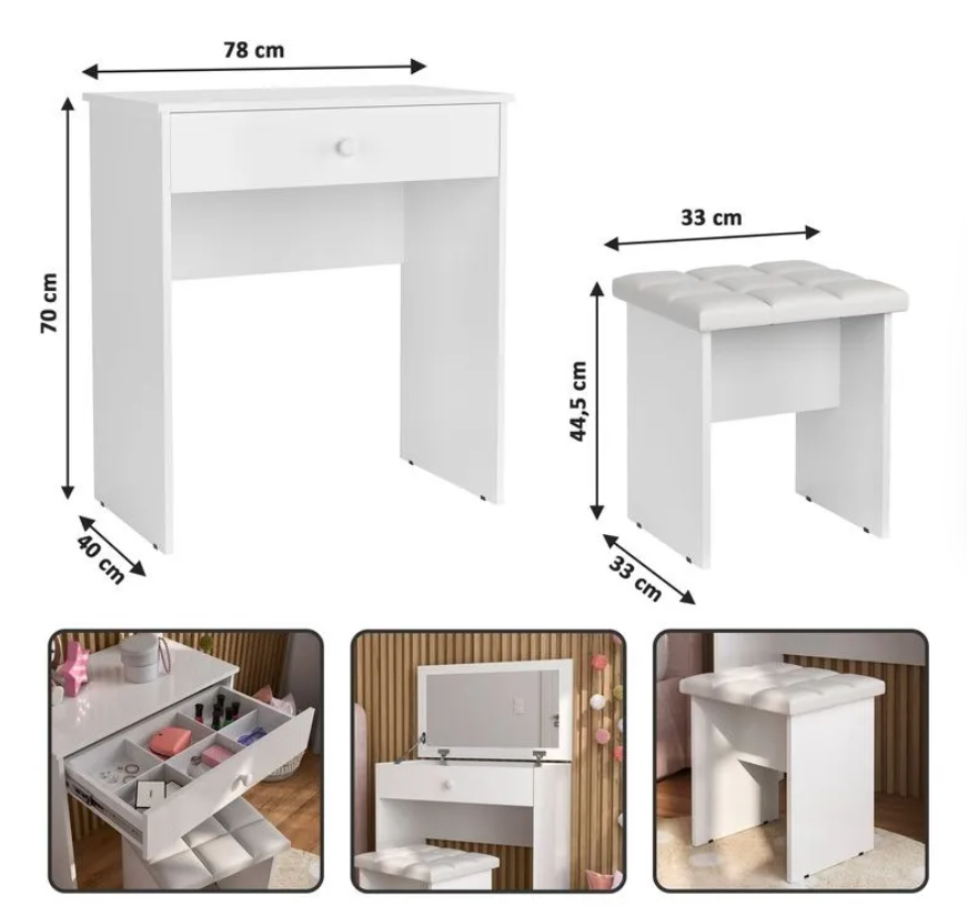 The dressing table with drawers provides ample storage for cosmetics, jewelry, and personal accessories, helping you stay organized. The comfortable stool ensures a relaxed grooming experience, while the large mirror adds a touch of sophistication and enhances your room’s brightness.