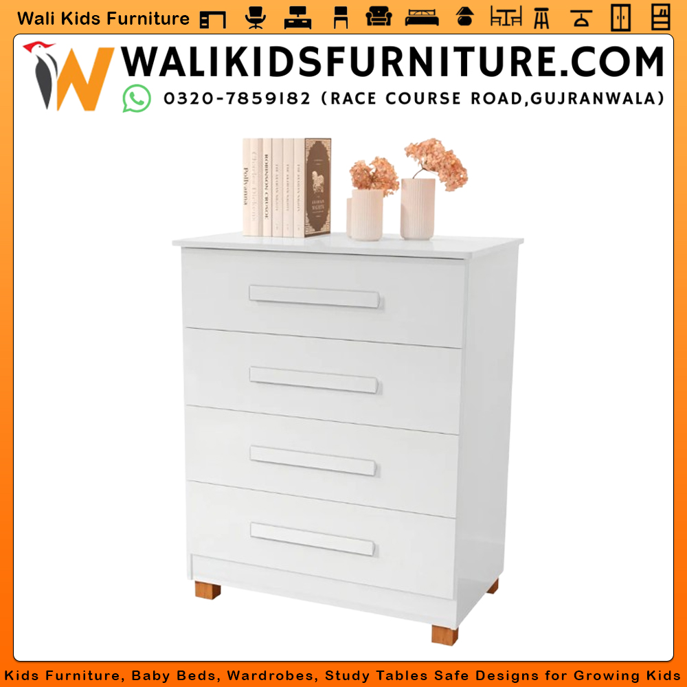 The smooth handles, safe edges, and high-quality structure make it ideal for everyday use. The four large drawers make organization simple, helping parents maintain a clean and clutter-free environment. As a standout piece of kids room furniture Pakistan, it blends perfectly with modern and colorful interiors.