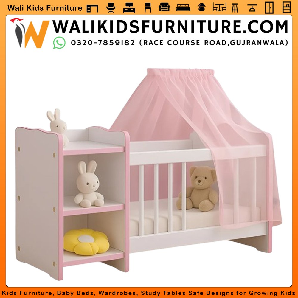 Perfect for gifting and pretend-play activities, this baby doll furniture piece helps kids learn responsibility and organization while having fun. The sturdy MDF structure guarantees durability, making it a reliable choice for parents seeking long-lasting kids toy furniture. Available exclusively at Wali Kids Furniture Gujranwala, this children doll crib is designed to inspire joyful moments every day.