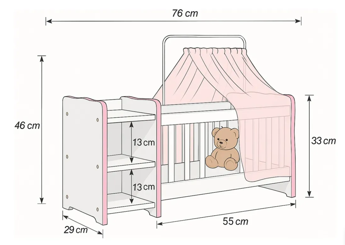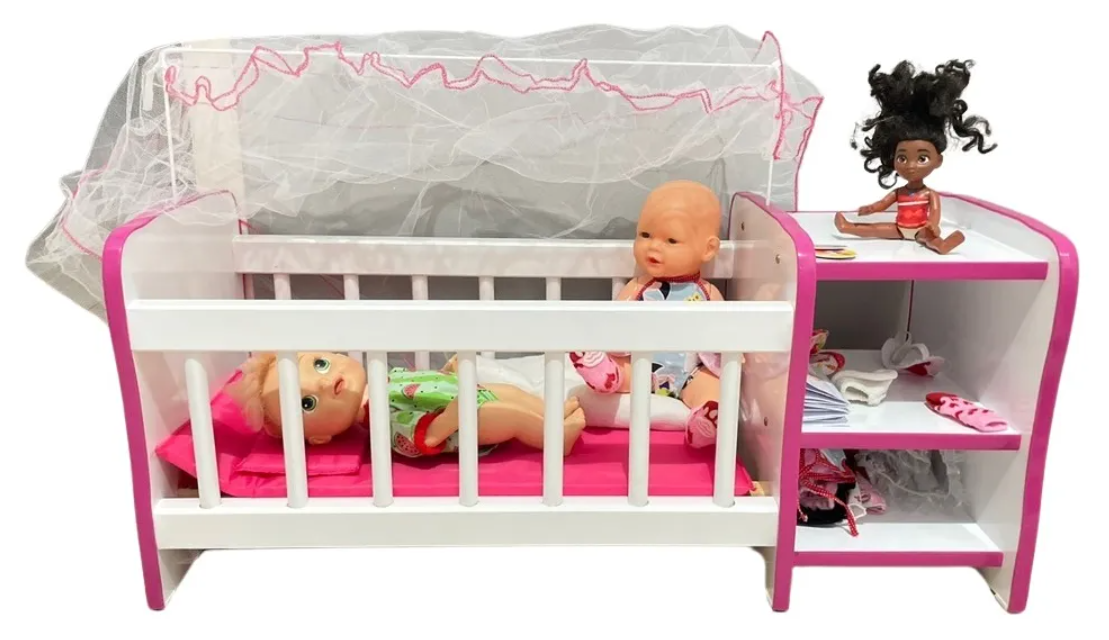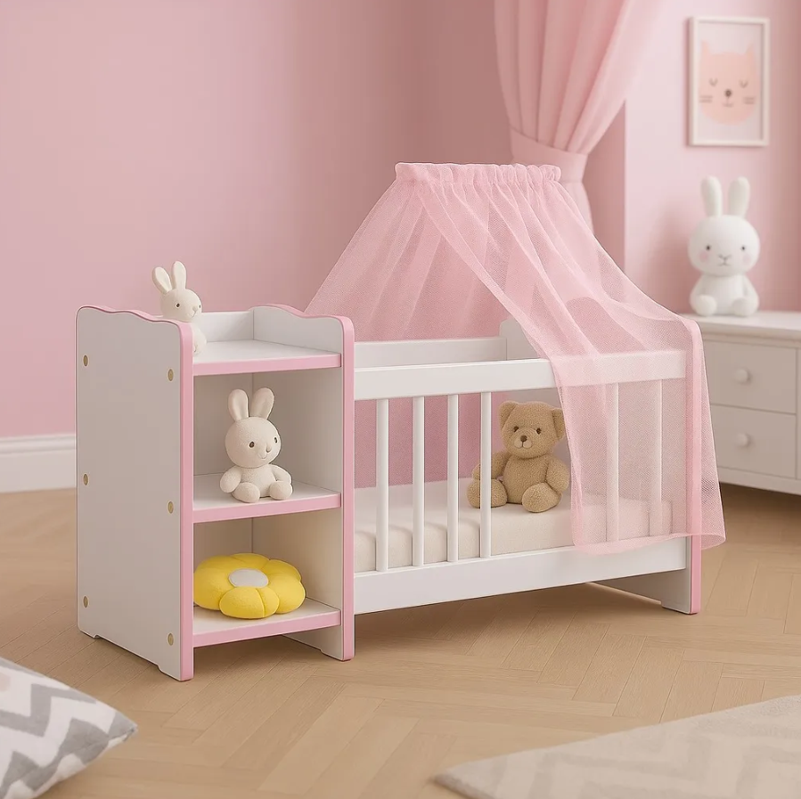 The crib comes with a compact doll dresser set, allowing children to store doll clothes and accessories neatly. With its smooth finish and rounded edges, this toy cot for girls ensures safe and enjoyable playtime. The decorative veil adds an elegant touch, making it a delightful doll bed with veil that enhances the beauty of any kids’ room.
