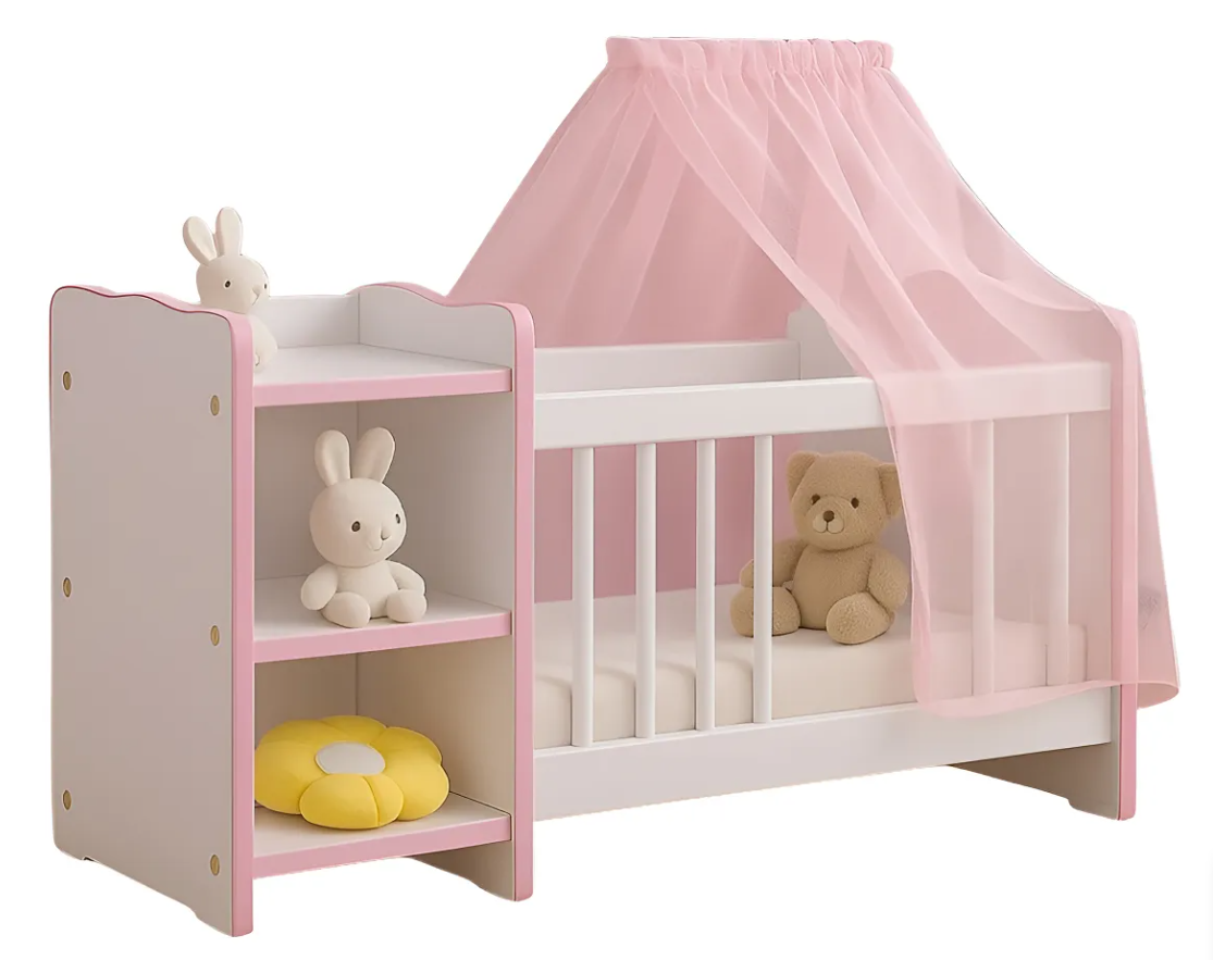 Toy Doll Crib with Veil & Dresser – Reborn Doll Bed & Teddy Bear Cradle (MDF) Wali Kids Furniture